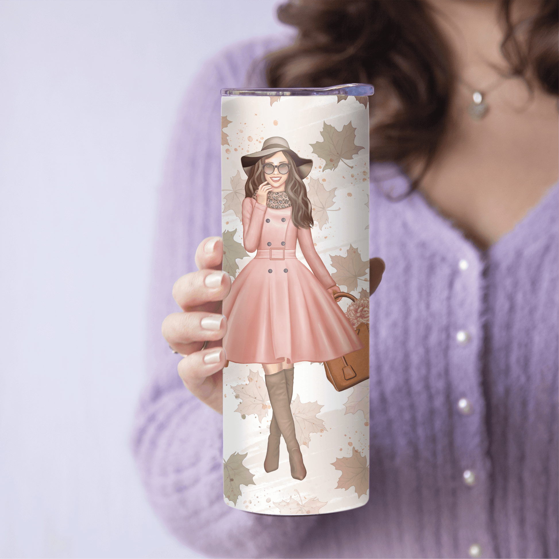 La Gourde Horizon 650 ml – Fashion Automne séduit par son design tendance et élégant. Habillée d’une silhouette féminine en manteau rose, entourée de feuilles aux teintes naturelles, elle apporte une touche chic et cosy à vos moments d’hydratation.